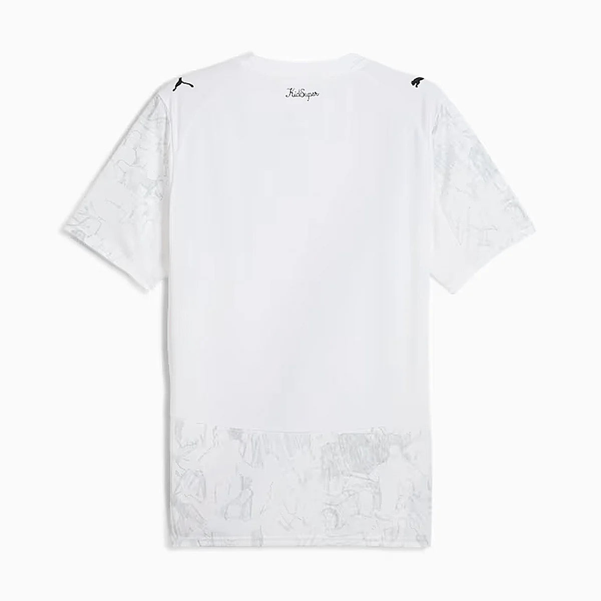 The classic is back ñ redrawn, repainted, and ready to play. The iconic sash design is back in the PUMA x KIDSUPER collection, reimagined with hand-painted graphics, a watercolor palette, and, as always with Manchester City, a whole lot of character. Inspired by Manchesterís graft and the pure joy of the Pozna? celebration, itís a fresh spin on a fan favorite ñ ready to show up on the global stage..